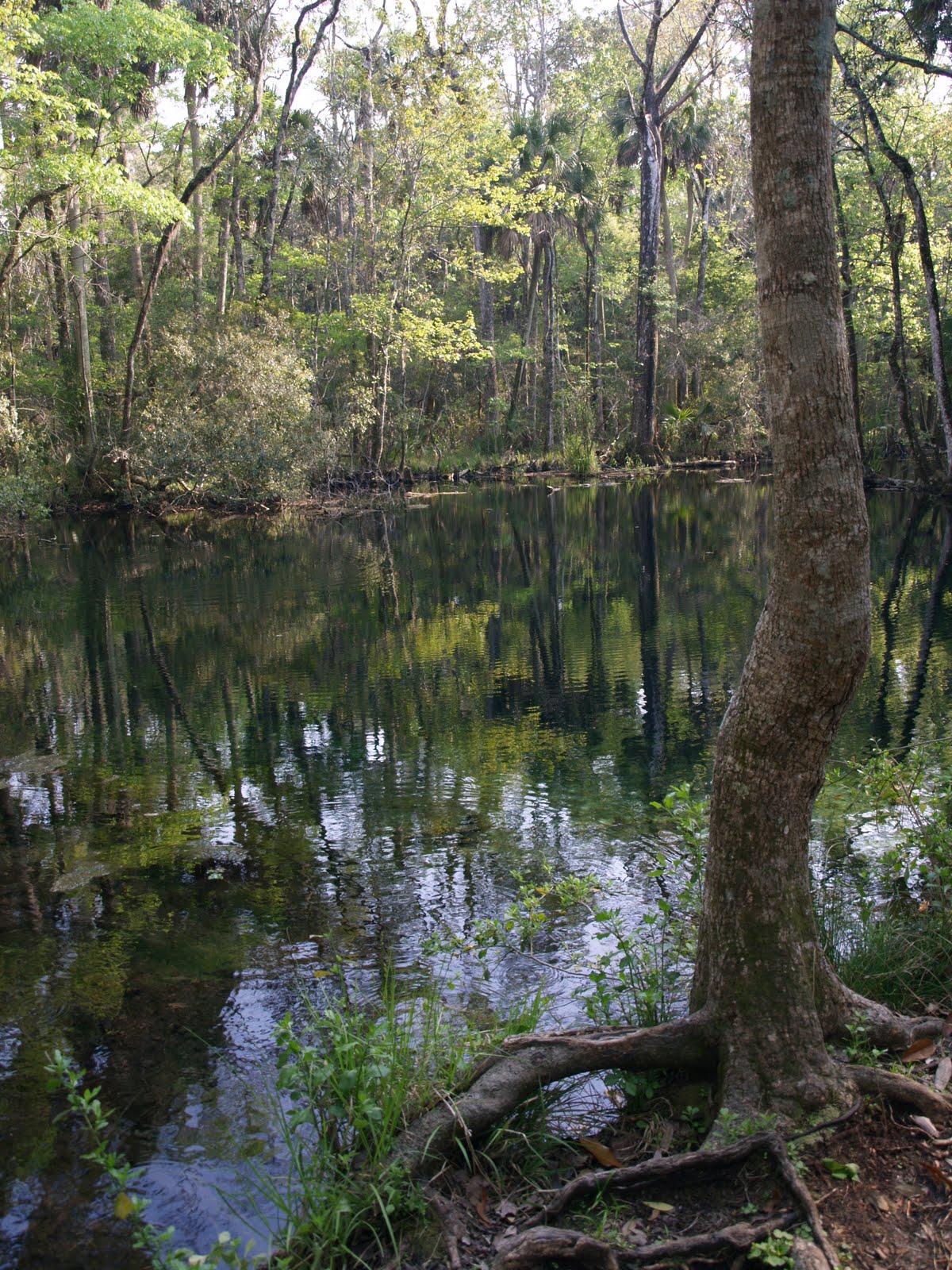 We had a road walk to cross the Wakulla River on the highway bridge. The river is extremely clear because the volume of water actually comes from a great huge spring. It serves as a habitat for manatees which can munch on the aquatic plants and swim in the pristine waters. The trail returns to the trees a short distance after the bridge crossing and leads to "The Cathedral", a large stand of palms whose fronds form a natural vaulted ceiling, the soft light passing through them reminiscent of the effect of stained glass windows, the trunks forming row upon row of columns. An equally lovely natural spot is Shepherd Spring, its clear waters providing the first drinkable water since the Aucilla River. We filled our water containers, had a snack and headed for camp which was about a half mile away.